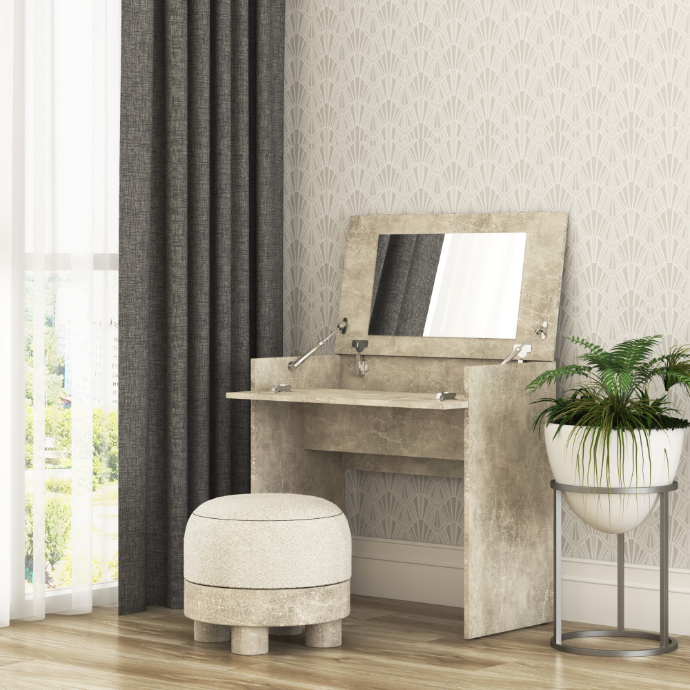 Стільниця, що відкидається, відкриває простору нішу для зберігання косметики, аксесуарів, прикрас та інших необхідних речей. Макіяжний столик створений для вашого комфорту – він допоможе організувати всі засоби догляду в одному місці. Ідеально підходить для ранкових ритуалів макіяжу або вечірнього догляду за обличчям.