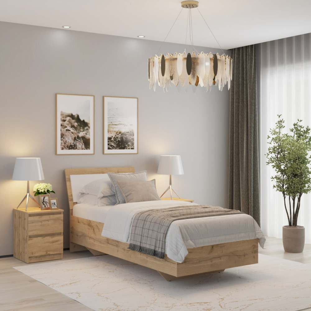 Односпальне ліжко MebelStar "Б'янка" 90x200 см у кольорах Дуб тахо та Аляска білий — зручне рішення для спальні або кімнати підлітка. Цей мінімалістичний подіумний дизайн відмінно підходить тим, хто віддає перевагу ліжкам без ніжок. Міцні ортопедичні ламелі забезпечують відмінну підтримку для матраца та створюють комфортні умови для сну.