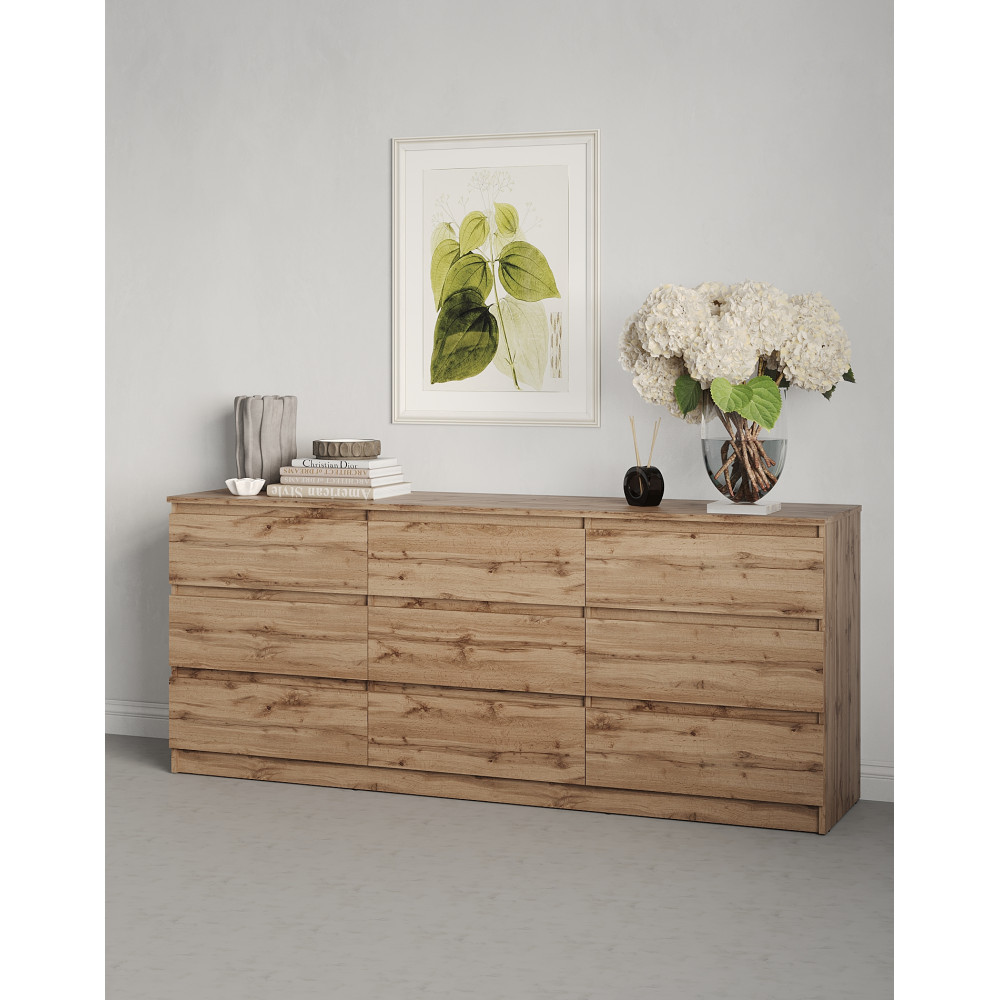 Комод оснащен 9-ю ящиками на телескопических направляющих, которые гарантируют плавное и бесшумное выдвижение. Это удобное решение для хранения одежды, белья, документов, аксессуаров и других важных вещей, обеспечивая их систематизацию и легкий доступ к содержимому.