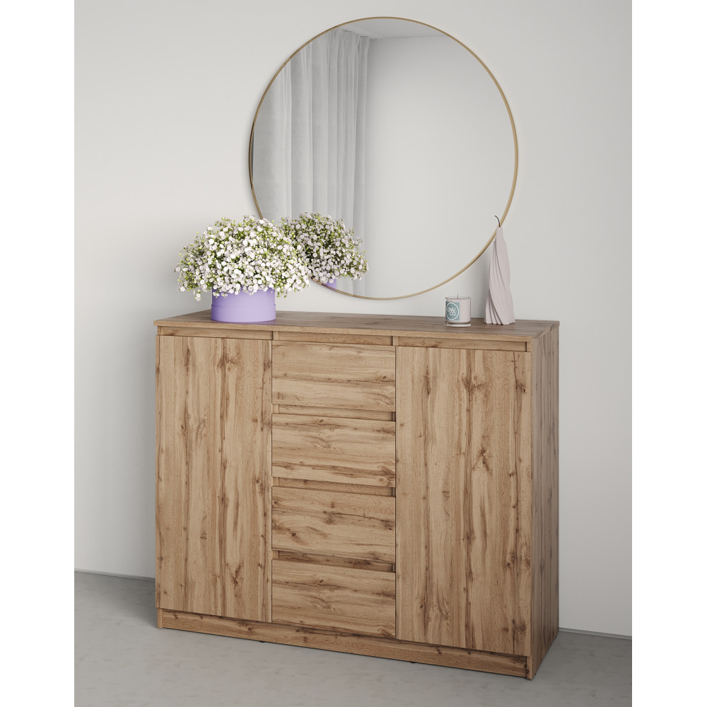 Модель оснащена четырьмя выдвижными ящиками, которые работают на телескопических направляющих полного выдвижения, что обеспечивает легкий доступ к содержимому. Также с боков комода предусмотрены две дверцы, за которыми скрываются дополнительные полки для удобного хранения вещей. Этот комод для вещей идеально подходит для организации пространства и упорядочивания различных предметов в спальне или гостиной.