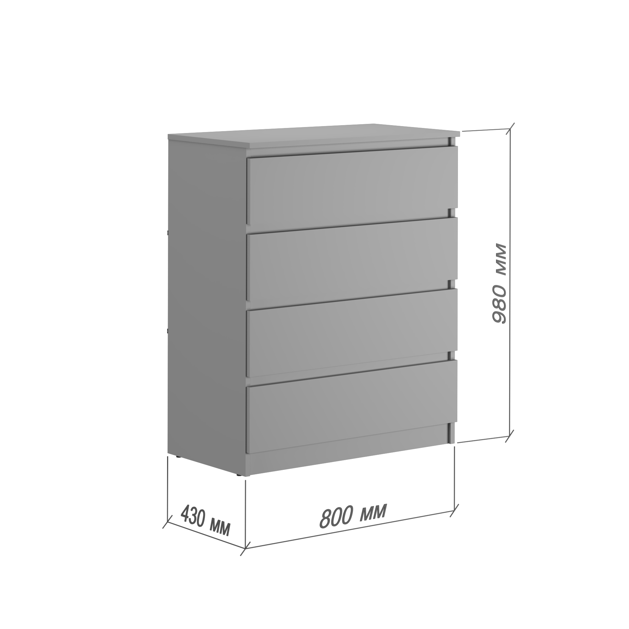 Выполнен из качественного ДСП, которое является идеальным материалом для мебели благодаря своей прочности и долговечности. Комод для вещей оснащён четырьмя вместительными выдвижными ящиками на телескопических направляющих, которые гарантируют плавный и бесшумный ход. Благодаря своей вместительности и эргономичному дизайну, он станет идеальным выбором для спальни, гостиной или даже прихожей.