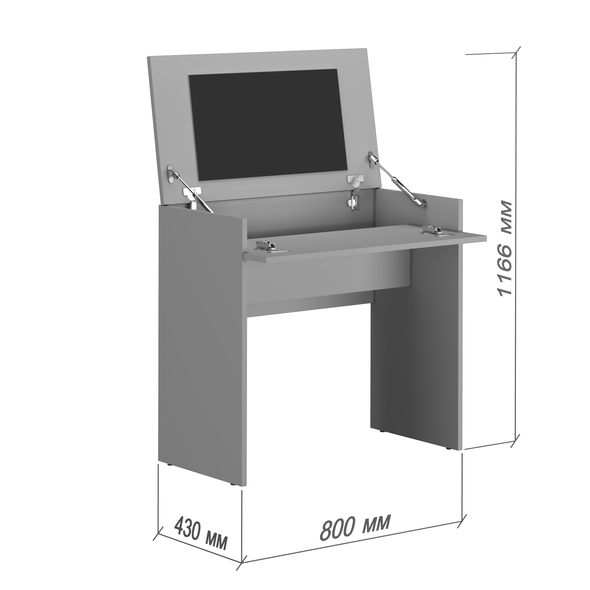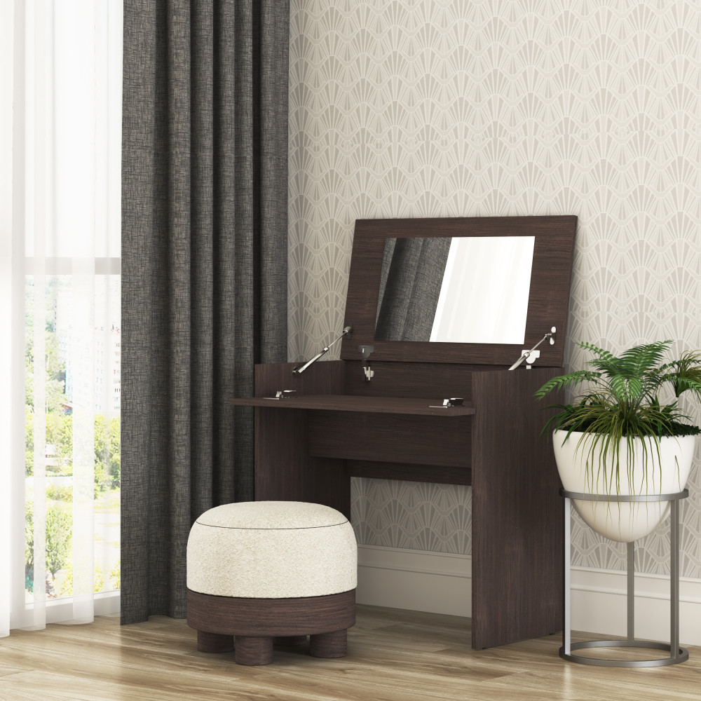 Столешница, которая откидывается, открывает просторную нишу для хранения косметики, аксессуаров, украшений и других необходимых вещей. Столик для макияжа создан для вашего комфорта – он поможет организовать все средства ухода в одном месте. Идеально подходит для утренних ритуалов макияжа или вечернего ухода за лицом.