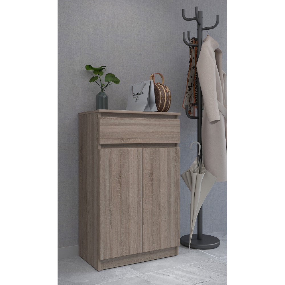 Тумба оснащена просторным ящиком в верхней части на телескопических направляющих полного выдвижения для хранения ключей, мелких аксессуаров или других необходимых предметов. Два удобных отсека с полками за дверцами обеспечивают достаточно места для обуви, помогая поддерживать порядок в прихожей.