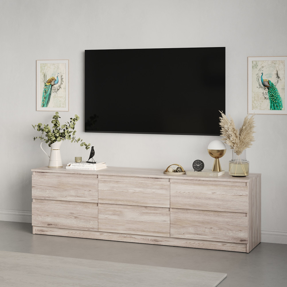Эта длинная тумба под телевизор идеально подходит для просторных комнат и больших телевизоров, предоставляя достаточно места для техники, декоративных аксессуаров или книг. Ящики позволяют эффективно организовать хранение всех необходимых вещей, скрывая их от посторонних глаз.