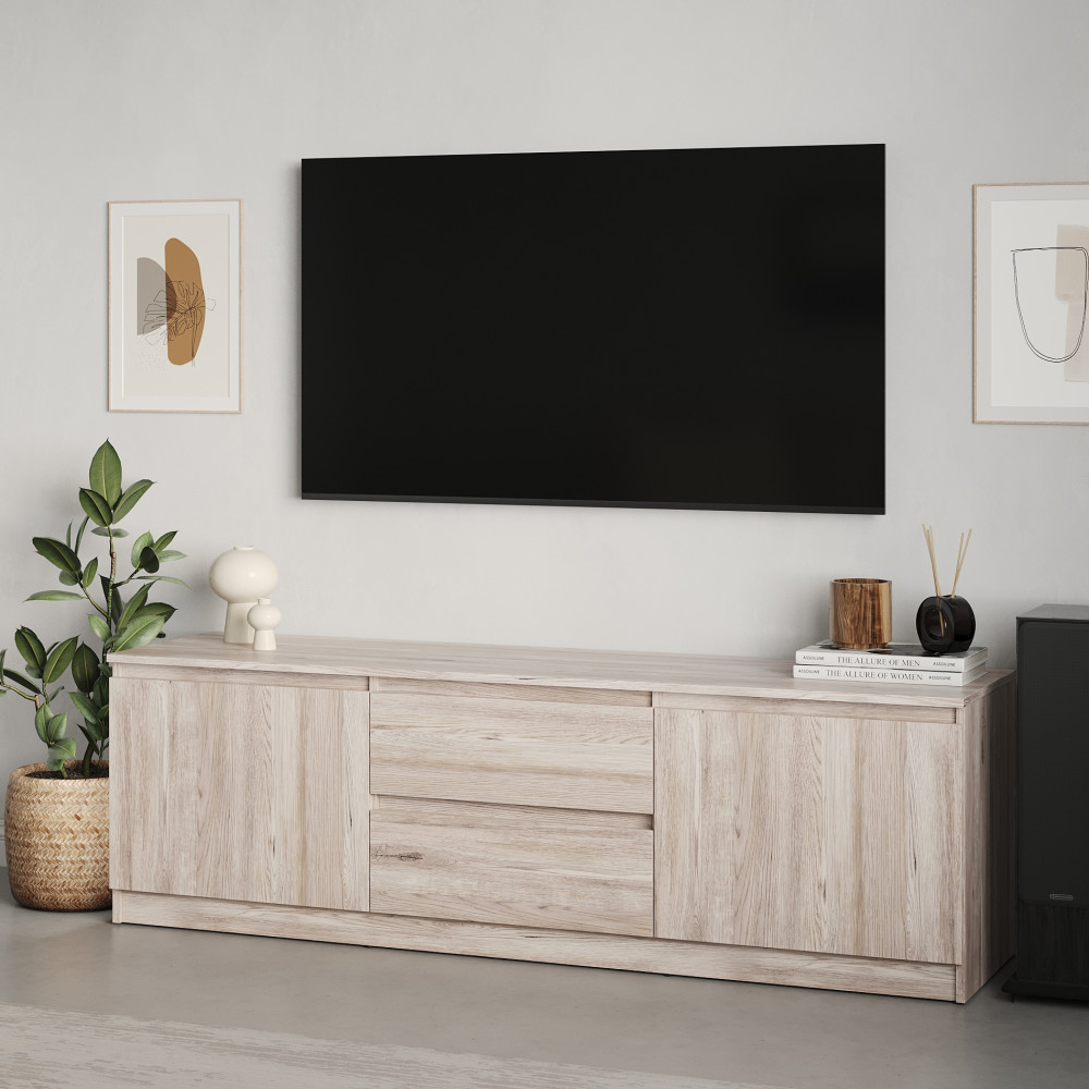 Эта ТВ тумба отлично подходит для больших телевизоров и позволяет организовать все сопутствующие аксессуары, такие как колонки, медиаплееры или игровые приставки. Закрытые отделения помогут поддерживать порядок и скрыть провода и технические детали.