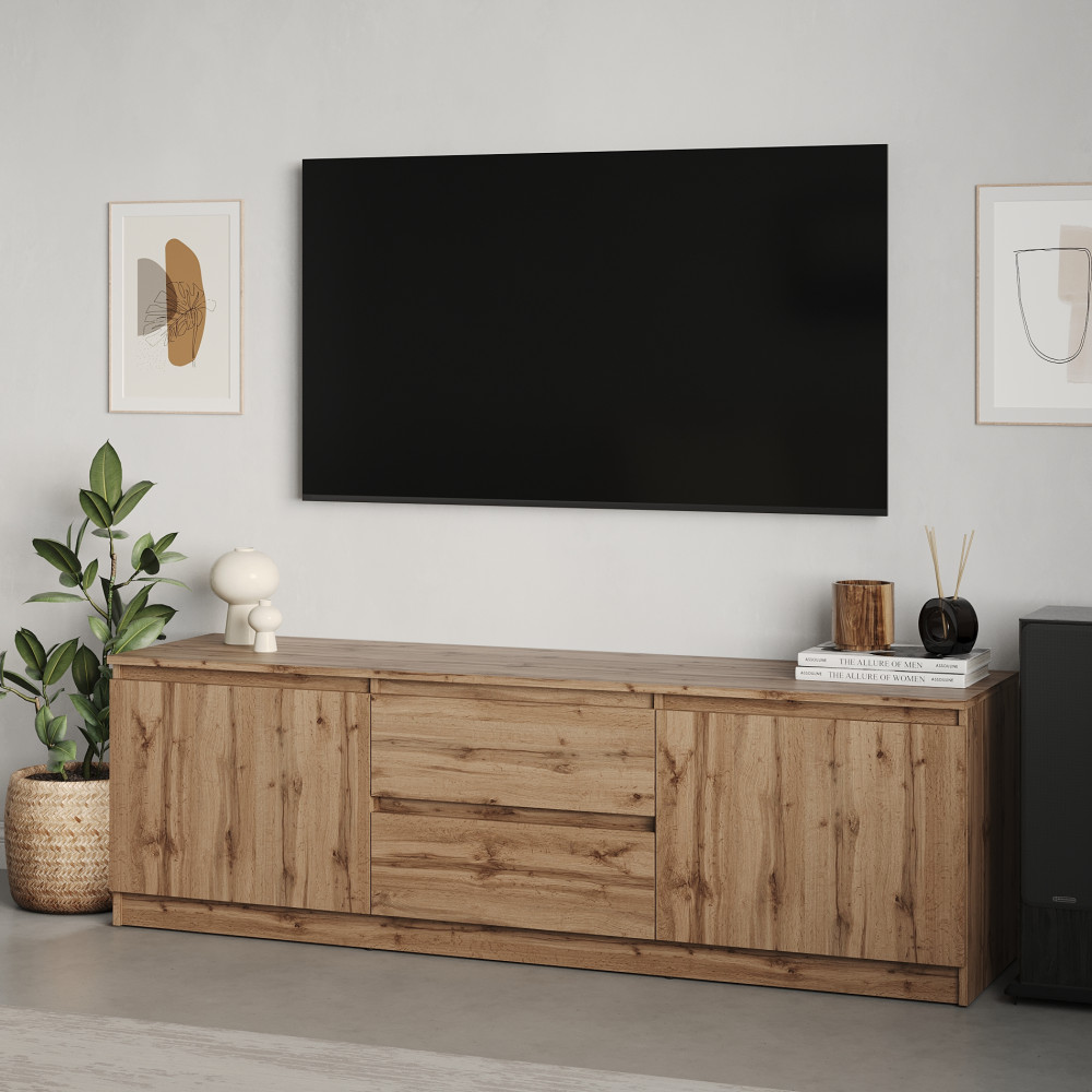 Тумба оснащена двумя вместительными ящиками на телескопических направляющих, которые позволяют удобно хранить пульты, диски, документы и другие необходимые вещи. Кроме того, две закрытые секции с дверцами предоставляют дополнительное место для техники, книг или декоративных предметов, скрывая их от посторонних глаз.