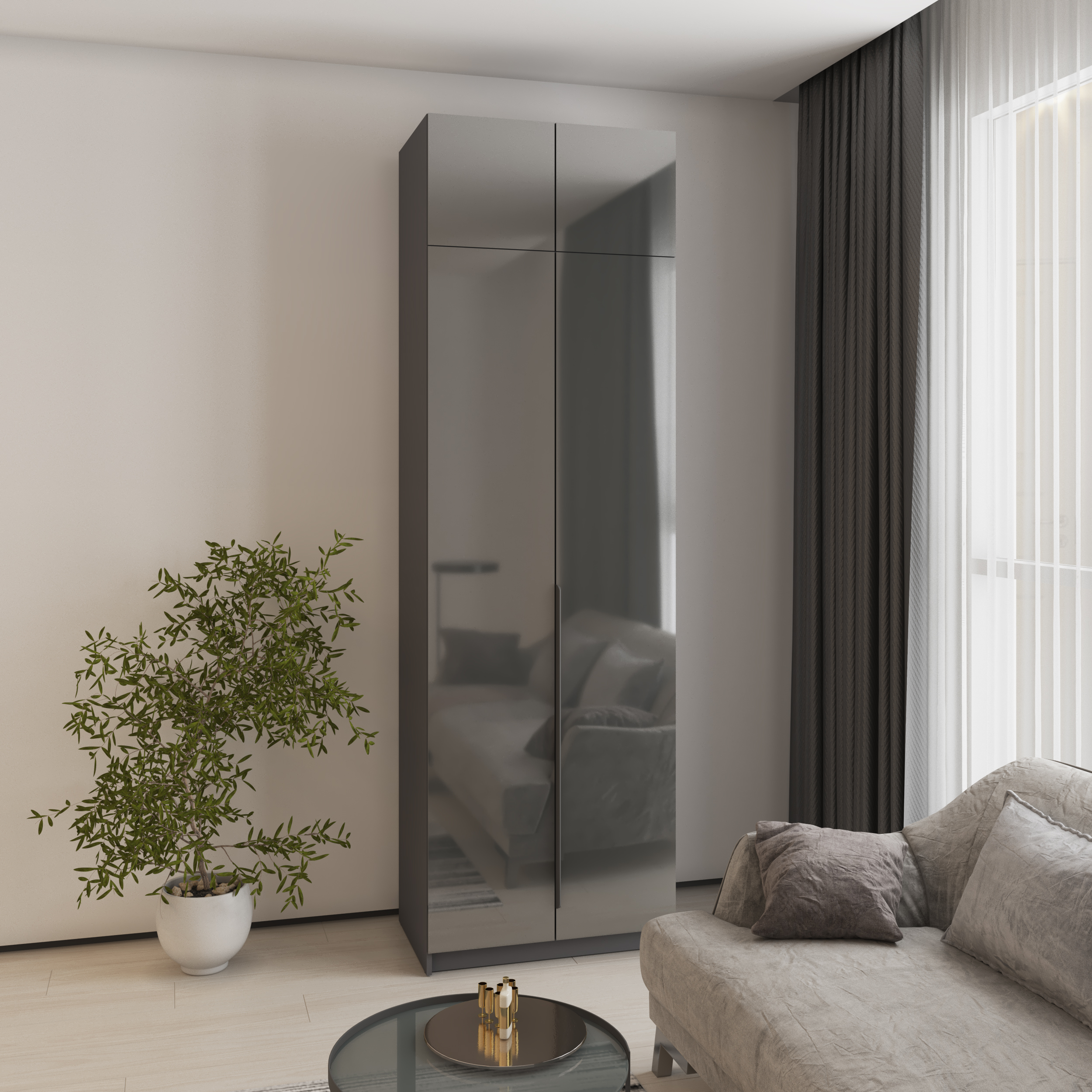 - Для спальни лучше всего подойдет шкаф купе с зеркалом — это не только визуально расширяет пространство, но и добавляет функциональности.