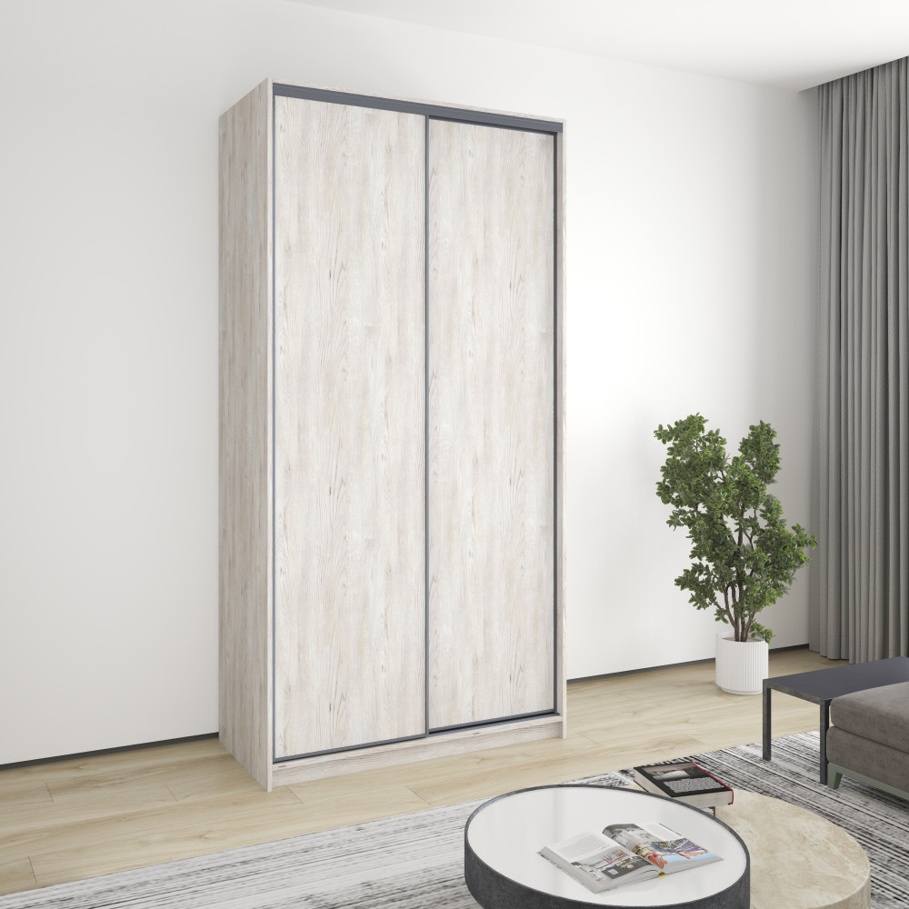 Шкаф оснащён раздвижной системой с алюминиевым профилем в цвете матовый антрацит и роликовым механизмом повышенной износостойкости. Качественные подшипники обеспечивают бесшумное скольжение дверей, а регулируемая высота профиля позволяет компенсировать неровности пола. Это гарантирует долгий срок службы и удобство эксплуатации.