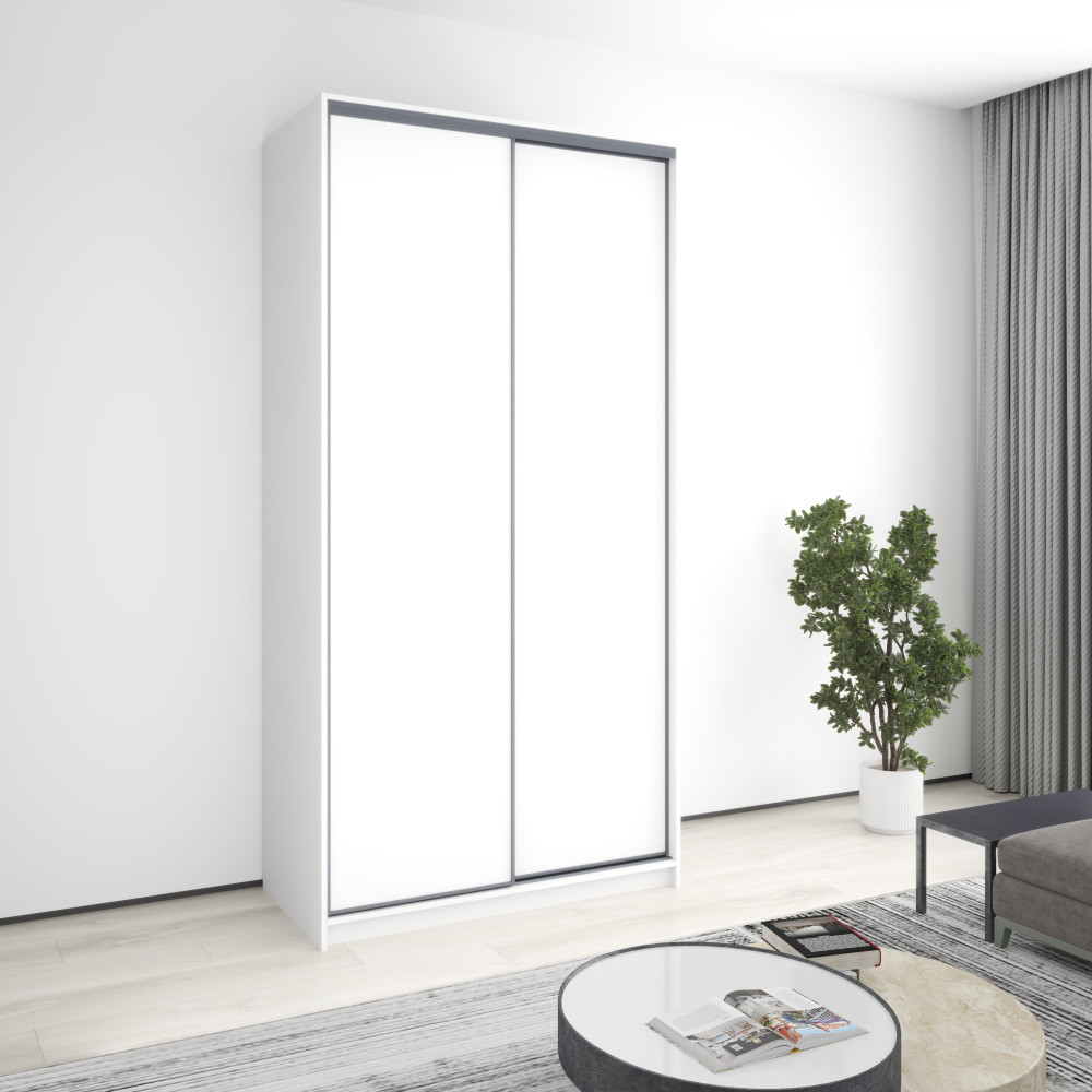 Шкаф оснащён раздвижной системой с алюминиевым профилем в цвете матовый антрацит и роликовым механизмом повышенной износостойкости. Качественные подшипники обеспечивают бесшумное скольжение дверей, а регулируемая высота профиля позволяет компенсировать неровности пола. Это гарантирует долгий срок службы и удобство эксплуатации.
