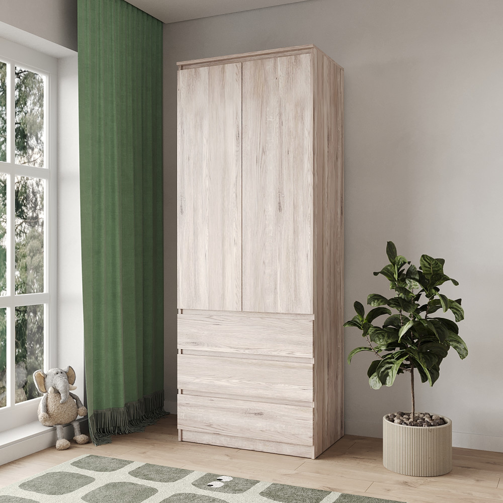 Изделие выполнено из надежного ДСП высокого качества, что обеспечивает долговечность и устойчивость к ежедневному использованию. Модель оснащена распашными дверцами и тремя выдвижными ящиками, которые позволяют удобно организовать хранение одежды, постельного белья и аксессуаров. Внутренняя полка и штанга для одежды предоставляют пространство для оптимальной организации вещей.