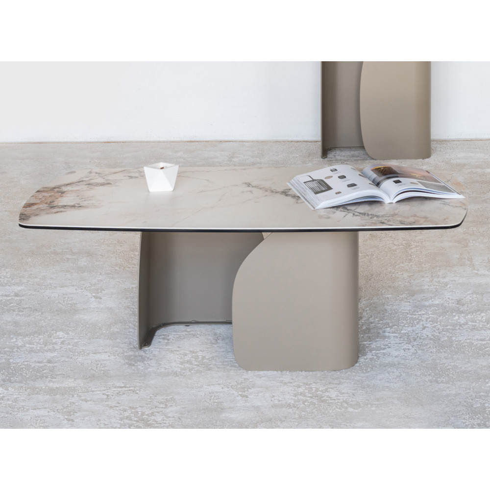 Прямоугольная столешница выполнена из матовой керамики и закалённого стекла, что делает её устойчивой к механическим повреждениям, влаге и воздействию высоких температур. Поверхность легко сохраняет безупречный вид, а насыщенный оттенок Аврора Голд придаёт столу выразительность и премиальный шарм.